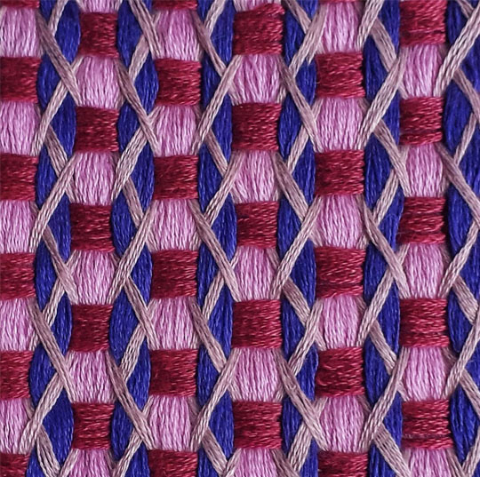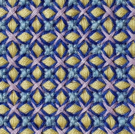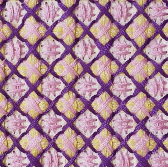 Treliças, ponto Lattice, bordado. Linha mouline Anchor em etamine.